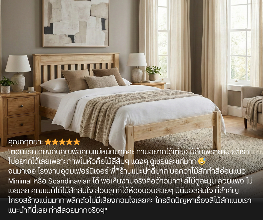 จนมาเจอ โรงงานอุดมเฟอร์นิเจอร์ พี่ที่ร้านแนะนำดีมาก บอกว่าไม้สักทำสีอ่อนแนว Minimal หรือ Scandinavian ได้ พอเห็นงานจริงคือว้าวมาก! สีไม้ดูละมุน สวยแพง ไม่เชยเลย คุณแม่ก็ได้ไม้สักสมใจ ส่วนลูกก็ได้ห้องนอนสวยๆ มินิมอลสมใจ ที่สำคัญโครงสร้างแน่นมาก พลิกตัวไม่มีเสียงกวนใจเลยค่ะ ใครติดปัญหาเรื่องสีไม้สักแบบเรา แนะนำที่นี่เลย ทำสีสวยมากจริงๆ"