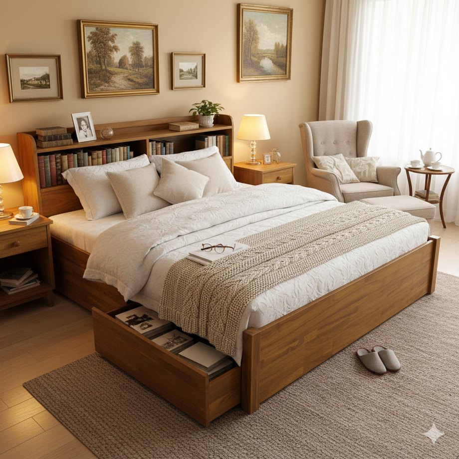 เตียงลิ้นชักช่วยให้จัดเก็บผ้าห่ม หมอน ผ้าปู หรือของใช้ต่าง ๆ ได้โดยไม่กินพื้นที่ห้อง เหมาะมากสำหรับบ้านที่ต้องการความเป็นระเบียบ