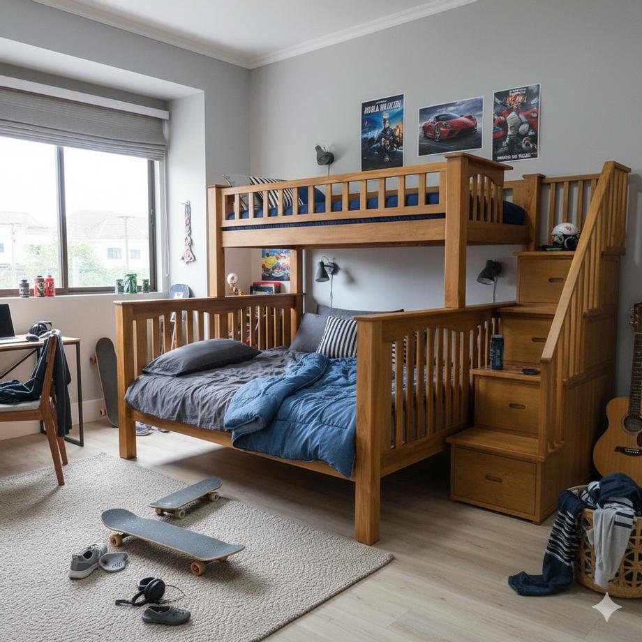 จุดเด่น: บันไดแบบกล่องที่มาพร้อมกับเตียง นอกจากจะช่วยให้ขึ้นลงง่ายแล้ว ยังสามารถใช้เป็นพื้นที่เก็บของได้อีกด้วย ช่วยให้ห้องเป็นระเบียบเรียบร้อยมากขึ้น เหมาะสำหรับเด็กวัยเรียนทั้งมัธยมต้นและมัธยมปลาย