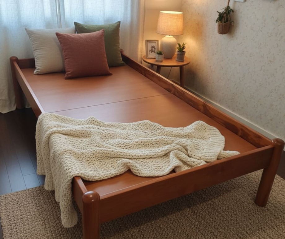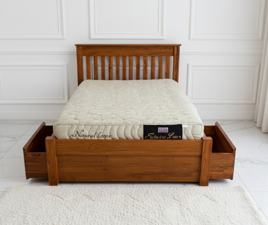 ลิ้นชักเก็บของใต้เตียง: เพิ่มพื้นที่จัดเก็บด้วยลิ้นชักไม้สักที่แข็งแรง สามารถเลือกทำได้ทั้งสองด้านของเตียง ช่วยให้ห้องเป็นระเบียบมากขึ้น