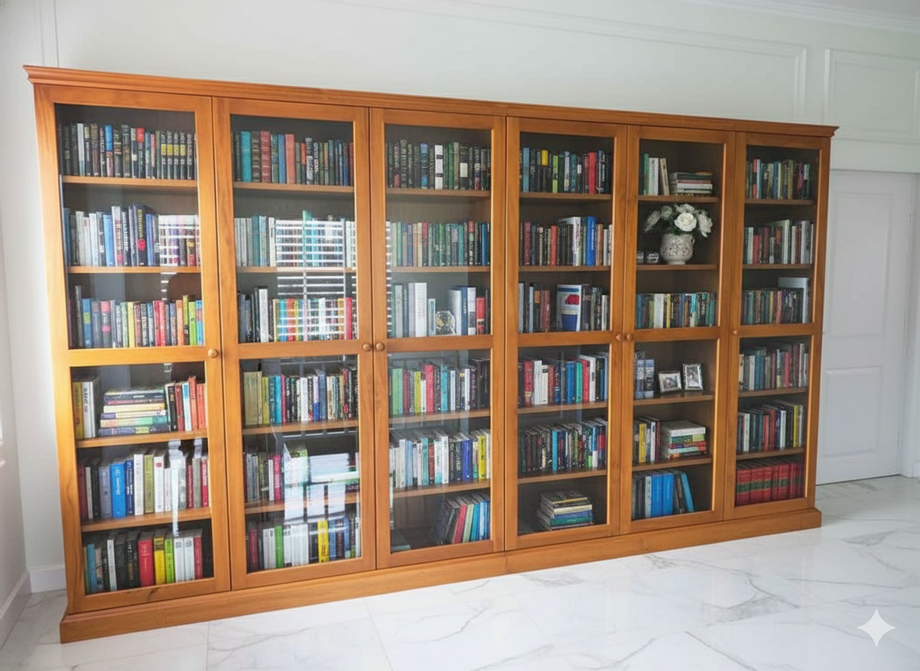 | 48ตู้หนังสือไม้สักผสมไม้อัดสัก ดีไซน์หรูหรา ขนาด 3.6 เมตร จุได้มากกว่า 500 เล่ม!