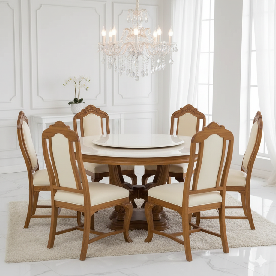 ชุดโต๊ะอาหารกลม สำหรับ 6ที่นั่งผลิตจากไม้สักแท้ TOP ด้วยหินสังเคราะห์ แบบที่ใช้ทำ เคาท์เตอร์ครัว ทำความสะอาดง่าย