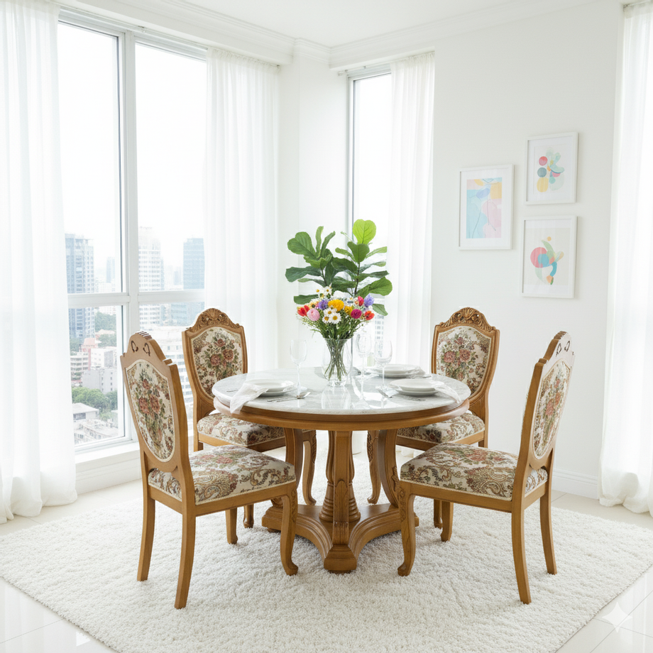 โต๊ะอาหารกลมไม้สัก ท้อปหินครีม่าครีม ขนาด 1.5เมตร