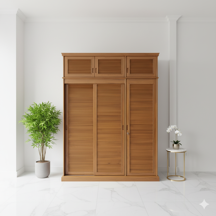 ตู้เสื้อผ้าบานซ้อน หน้าบานไม้สักแท้ รุ่นนี้ ออกแบบให้มีช่องระบายอากาศ ช่วยป้องกันความชื้นและกลิ่นอับ ภายในแบ่งสัดส่วนใช้งานได้ครบ ทั้งราวแขวน ชั้นวาง และลิ้นชักเก็บของ