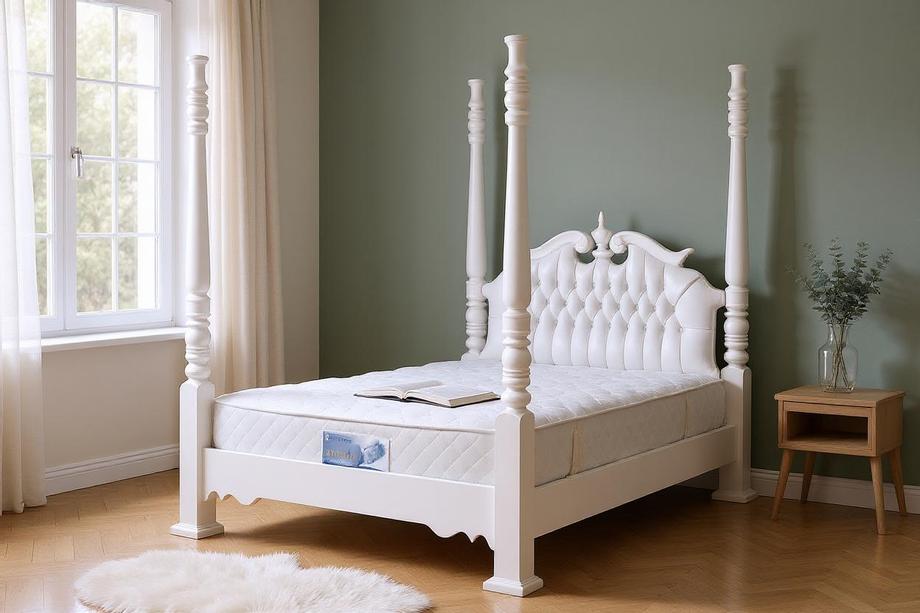 เตียงไม้สักขนาด 3.5 ฟุต ทำสีขาวสะอาดตา หัวเตียงบุหนังลอนลึก ตอกหมุดแน่น ดีไซน์สวยแบบเจ้าหญิง เสาเตียง 4 มุมให้ความรู้สึกหรูหราและนุ่มนวล เหมาะกับห้องนอนเด็กสาว วัยรุ่น หรือผู้ใหญ่ที่ชอบบรรยากาศละมุนอบอุ่น