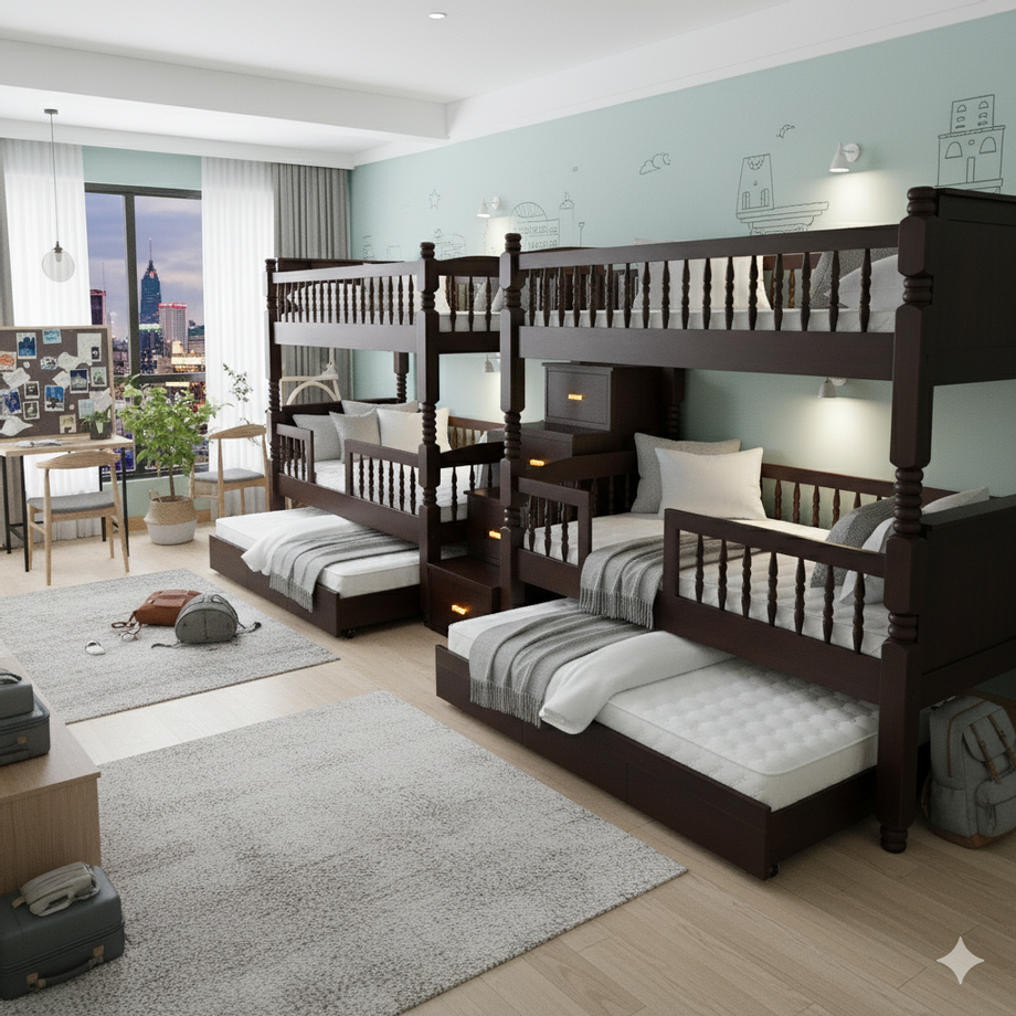 เตียงรุ่นนี้เป็นแบบ 2 ชั้นคู่ พร้อมบันไดตรงกลาง แยกเป็นเตียงเดี่ยว 6 เตียง นอนได้พร้อมกัน 6 คน โครงสร้างผลิตจากไม้สักแท้ แข็งแรง ทนทาน ไม่กลัวปลวก ใช้งานได้จริงทั้งในบ้าน หอพัก หรือรีสอร์ต