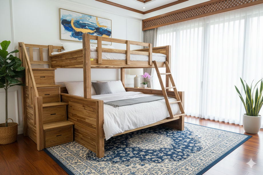 เตียงสองชั้นด้านล่าง 6 ฟุต ด้านบน 5 ฟุต นอนได้กว้างสบาย ประหยัดพื้นที่ สั่งผลิตเลือกสีได้ตามต้องการ ผลิตจากไม้สักแท้ มีกล่องบันไดเดินขึ้นลงง่ายๆ แข็งแรงทนทาน ไม่กลัวปลวก มอด