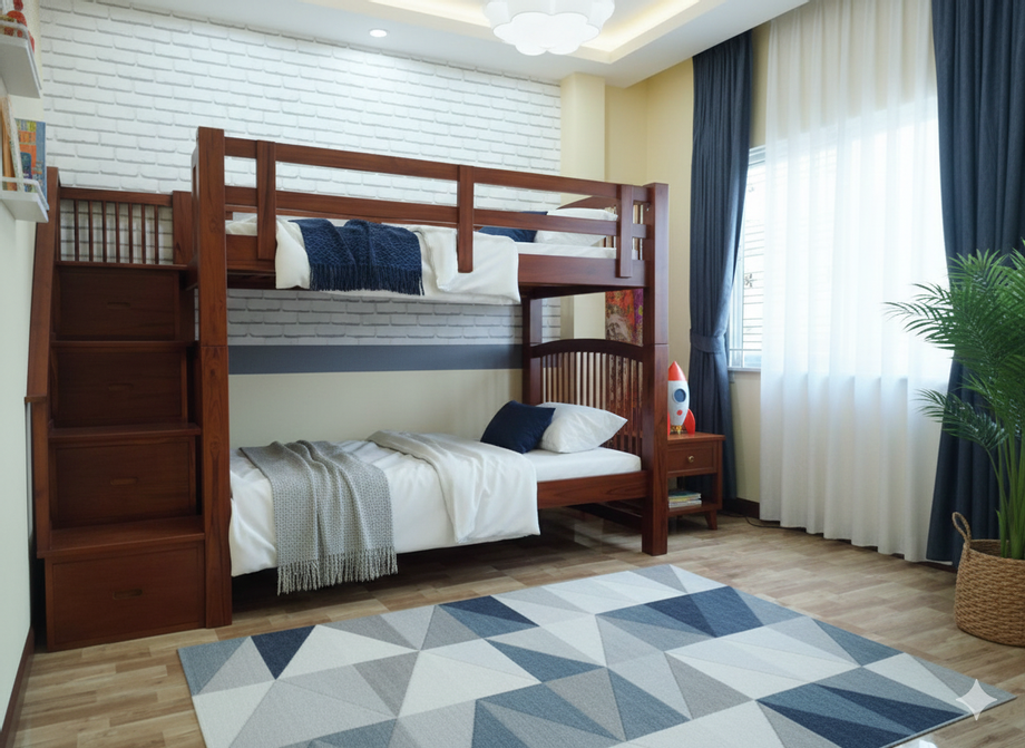 "เลือกเตียงไม้สีอ่อนแบบมีบันไดกล่องเพราะเข้ากับธีมบ้านค่ะ มันดูเหมือนเฟอร์นิเจอร์ชิ้นใหญ่ที่หรูหรากว่าเตียงสองชั้นทั่วไป แขกมาบ้านเห็นก็ชมว่าห้องลูกสวยมาก บันไดแบบนี้ทำให้เตียงดูไม่เหมือนเตียงเด็กหอพัก แต่ดูเหมือนห้องนอนในฝันของเด็กๆ จริงๆ ค่ะ"