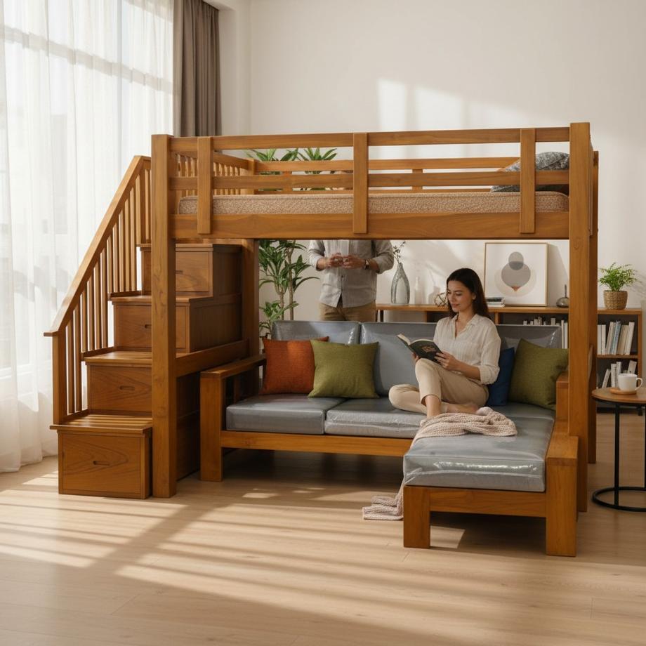 ตอบโจทย์การใช้พื้นที่อย่างคุ้มค่าด้วย เตียงยกสูง (Loft Bed) ที่ผสานฟังก์ชันการนอนและการพักผ่อนไว้ในชุดเดียวกัน ด้านบนเป็นเตียงนอนขนาด 3.5 ฟุต ส่วนด้านล่างออกแบบเป็นโซฟานั่งเล่นสุดสะดวก ประหยัดพื้นที่ เหมาะสำหรับห้องที่มีพื้นที่จำกัด เช่น คอนโด หรือห้องนอนสมัยใหม่