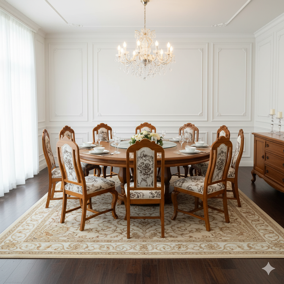 ชุดโต๊ะอาหารทรงกลม 10 ที่นั่ง โครงสร้างไม้แท้ แข็งแรงหรูหรา ออกแบบเพื่อให้ทุกคนมองเห็นหน้ากัน พูดคุยพร้อมรอยยิ้ม เหมาะสำหรับบ้านที่ให้ความสำคัญกับความอบอุ่นของครอบครัว